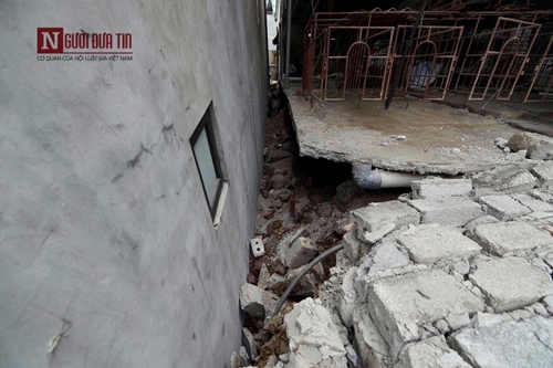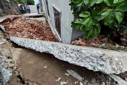 Kéo theo đó, một ngôi nhà của chủ hộ tên Vũ Văn Hào nằm sát cạnh đoạn đường cũng bị nghiêng theo. Phần tường bao tiếp giáp với đường cũng bị tách làm đôi. |