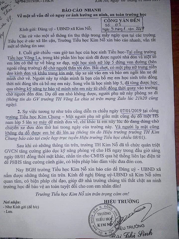 Trước thông tin thu thập được từ các trường lân cận, để đảm bảo an toàn cho học sinh, đồng thời nâng cao cảnh giác đối với toàn thể thầy cô, học sinh và các bậc phụ huynh, Hiệu trưởng trường tiểu học Kim Nỗ Bùi Thị Sinh (có vị trí địa lý sát địa bàn trường Kim Chung và Võng La), đã có văn bản báo cáo nhanh “Về một số vấn đề có nguy cơ ảnh hưởng an ninh, an toàn trường học” gửi UBND xã để có biện pháp kịp thời thắt chặt an ninh trường học bảo đảm an toàn cho học sinh và nhân dân trên địa bàn.