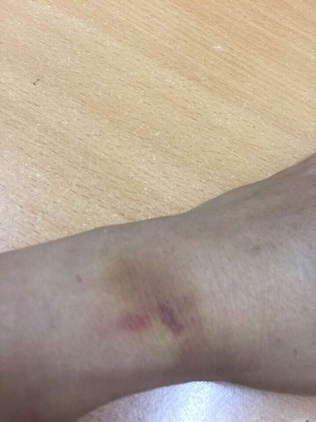 Vết bầm tím vẫn hằn rõ trên cổ tay chị Bình (ảnh do nhân vật cung cấp). |