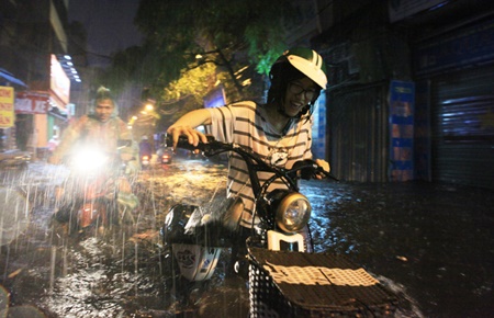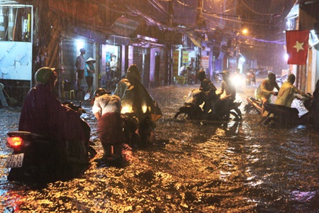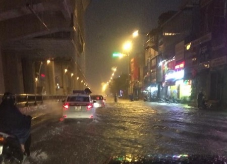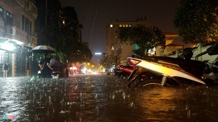 Trận mưa bắt đầu khoảng 19h30, ngay sau đó nhiều tuyến đường bắt đầu ngập nước, người dân cùng các phương tiện di chuyển khó khăn trên đường phố Hà Nội.