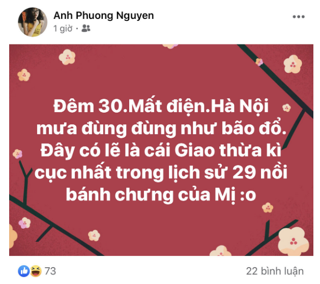 Trên mạng xã hội, nhiều người cũng than phiền tình trạng mưa gió kèm mất điện đêm giao thừa.