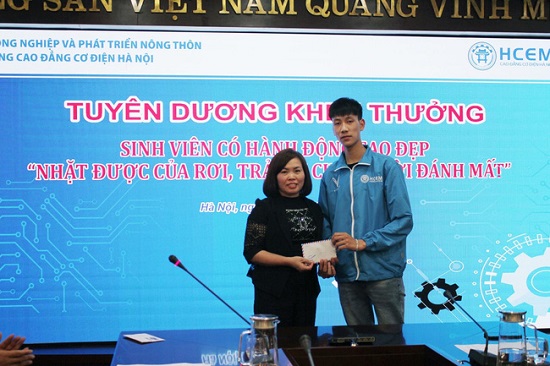 Trường Cao đẳng Cơ điện Hà Nội đã tổ chức tuyên dương một nam sinh viên vì hành động cao đẹp nhặt được của rơi trả người đánh mất.