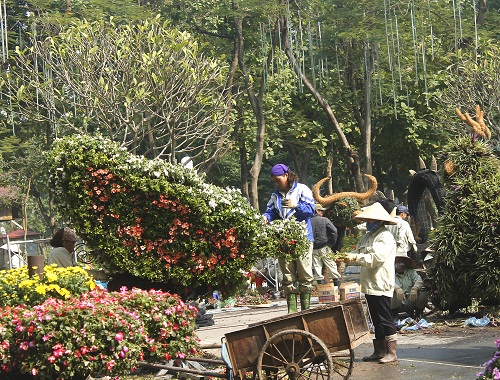 | Lực lượng công nhân đang tỉa hoa trên các con giáp được tạo hình. |