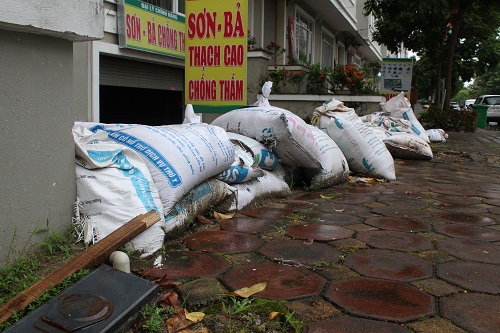 Để phòng tránh ảnh hưởng của hoàn lưu bão có thể gây mưa lớn, ngập lụt nhiều người dân Thủ đô đã cùng nhau mua đất, cát về đóng thành từng bao tải “đắp đê”, ngăn chặn nước mưa tràn vào nhà. |