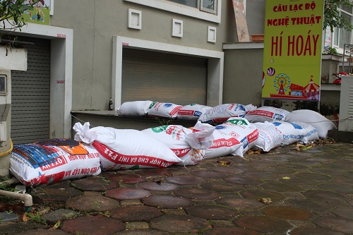 | Những bao cát được xếp thành hàng chặn trước cửa hầm để xe, vẫn để một lỗi để cho tiện di chuyển xuống khi trời chưa mưa. |