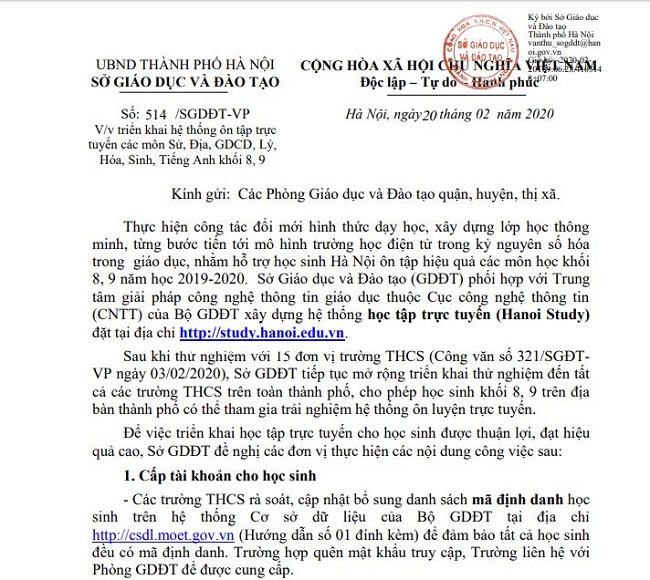 Cụ thể, thực hiện công tác đổi mới hình thức dạy học, xây dựng lớp học thông minh, từng bước tiến tới mô hình trường học điện tử trong kỷ nguyên số hóa trong giáo dục, nhằm hỗ trợ học sinh Hà Nội ôn tập hiệu quả các môn học khối 8, 9 năm học 2019-2020, sở GD-ĐT phối hợp với Trung tâm giải pháp công nghệ thông tin giáo dục thuộc cục công nghệ thông tin (CNTT) của bộ GD-ĐT xây dựng hệ thống học tập trực tuyến (Hanoi Study) đặt tại địa chỉ http://study.hanoi.edu.vn