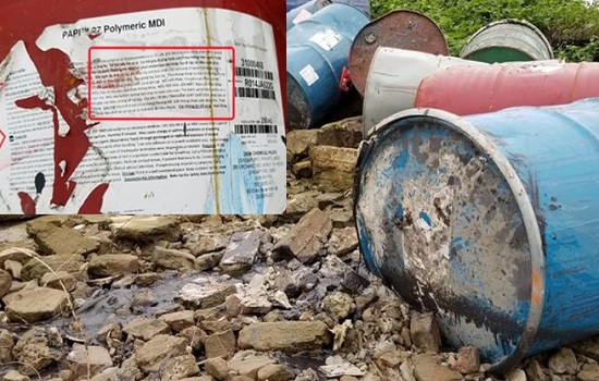 Theo thông tin còn lưu lại ở giấy dán trên vỏ một thùng phuy, thông tin này cảnh báo sự nguy hiểm của chất được ghi trong tờ giấy đó.