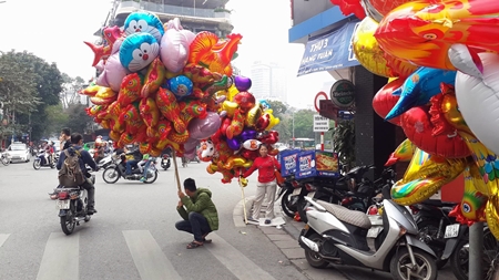Những chùm bóng bay bắt mắt được bán trên con phố Hàng Gai phục vụ người dân mua sắm. |