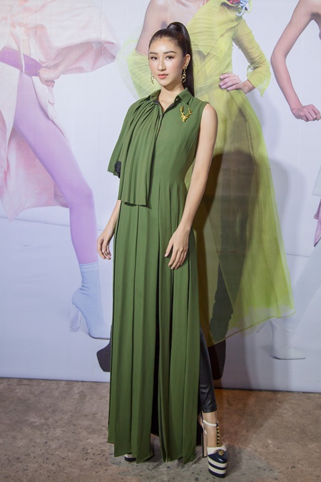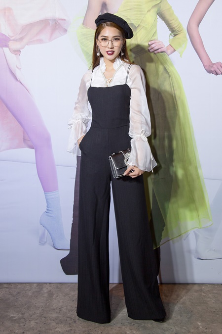 Trong khi Tường Linh ấn tượng với bộ jumsuit đơn sắc của thương hiệu Xita, phối hợp với phụ kiên thời thượng của Floral Punk thì Hà Thu có phần ma mị trong trang phục tua rua sắc xanh đầy bí ẩn của NTK Lê Thanh Hòa.