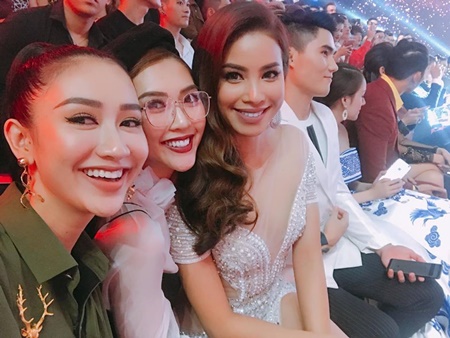 Cả 3 người đẹp được sắp xếp ngồi gần nhau nên không quên tranh thủ tạo dáng trước ống kính truyền thông rất thân mật và tự tin selfie ngay trước khi chương trình lên sóng. Phạm Hương cũng không quên gửi lời chúc đến Tường Linh và Hà Thu sẽ thi đấu thật tốt trong hai cuộc thi nhan sắc quốc tế sắp tới.
