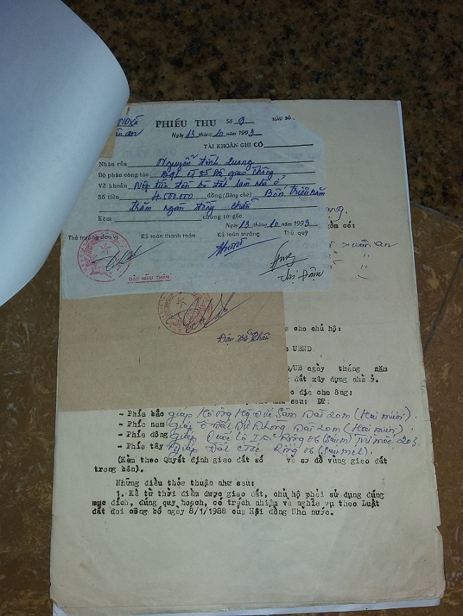 Phiếu thu tiền và giấy tờ đất của gia đình ông Nguyễn Đình Quang |