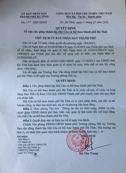 Điều khá bất ngờ, trong thời điểm toàn thành phố liên tục đối mặt với ngập lụt, người dân tìm cách khắc phục hậu quả của mưa lũ, Chủ tịch UBND TP Hà Tĩnh đã ra Quyết định 2300/QĐ-UBND, ngày 1/11/2016 về việc Cho phép thành lập Hội... Câu cá.
