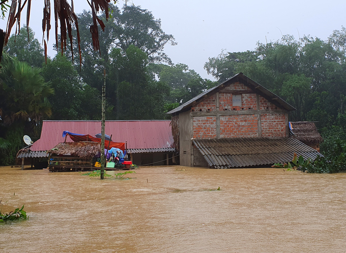 Còn mẹ con chị Nguyễn Thị Lương không kịp di chuyển lên vùng cao do nước dâng quá nhanh, họ phải ở lại trong căn nhà cấp bốn nước đã ngập gần tới tận nóc.