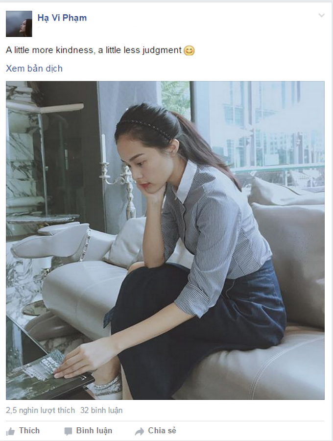 Trưa 30/10, một ngày lặn mất tăm sau scandal tình cảm liên quan đến Cường Đô la, người mẫu - diễn viên trẻ Hạ Vi đã chia sẻ status mới nhất ở trang Facebook riêng. Cô viết: “A little more kindness, a little less judgment” (tạm dịch: tử tế hơn một chút, phán xét ít một chút). Kèm theo đó là bức ảnh ghi lại cảnh cô đang ngồi trên ghế sofa một tay chống cằm, một tay cầm bìa tạp chí với vẻ mặt buồn rười rượi.