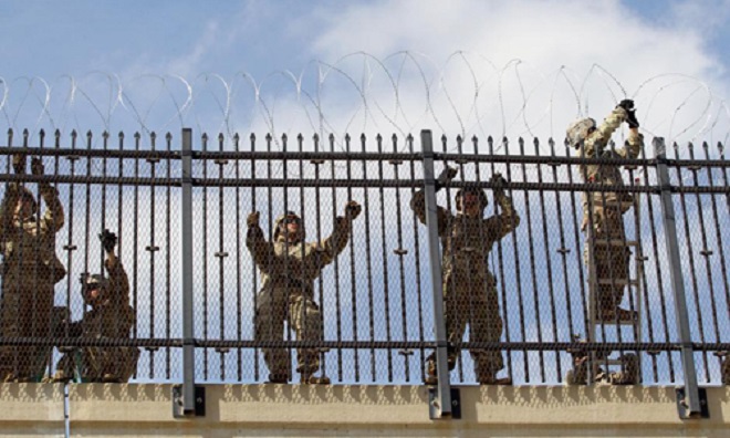 Quân đội Mỹ lắp đặt hàng rào dây thép gai ở biên giới Mỹ - Mexico, khu vực thuộc thành phố McAllen, bang Texas hôm 5/11. Ảnh: Reuters. |