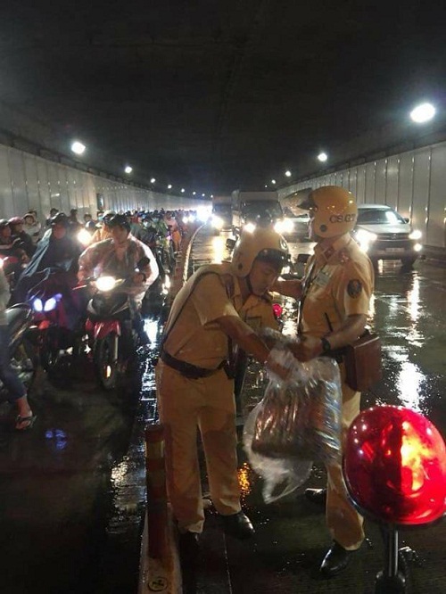 Đúng lúc đó, 2 chiến sỹ CSGT có mặt tại hầm Thủ Thiêm đã có hành động đẹp khi đi phát áo mưa miễn phí cho mọi người. Rất nhiều người dân khi chứng kiến cảnh tượng này đã cảm thấy vô cùng ấm lòng.