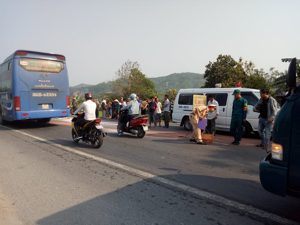 Va chạm mạnh khiến bà T. văng ra giữa đường tử vong tại chỗ. Chiếc xe khách chạy tiếp hàng trăm mét nữa mới dừng lại.