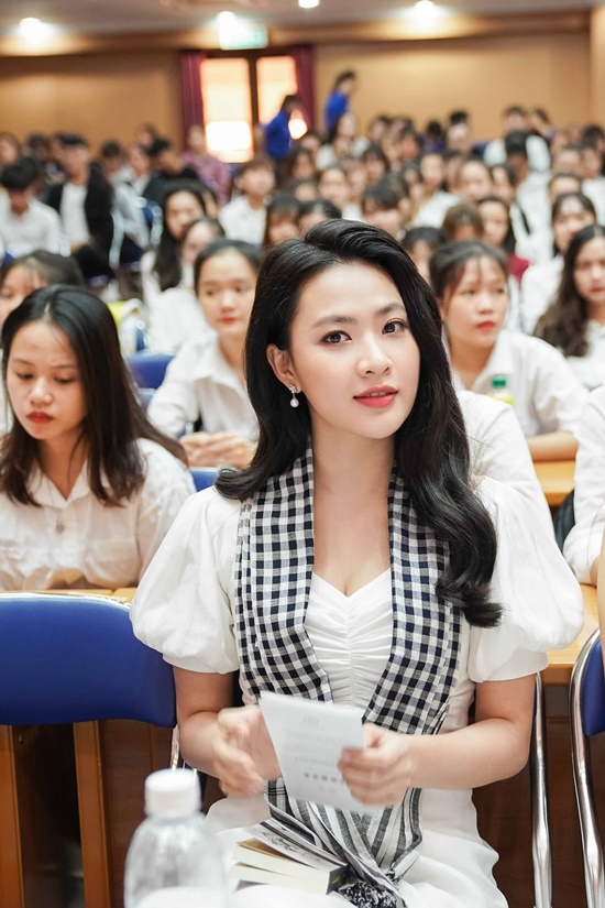 Á hậu Lệ Hằng và diễn viên Minh Trang khoe nhan sắc rạng rỡ khi giao hữu cùng sinh viên đại học.