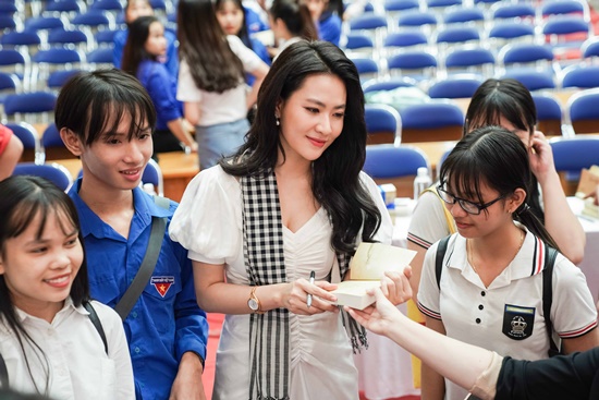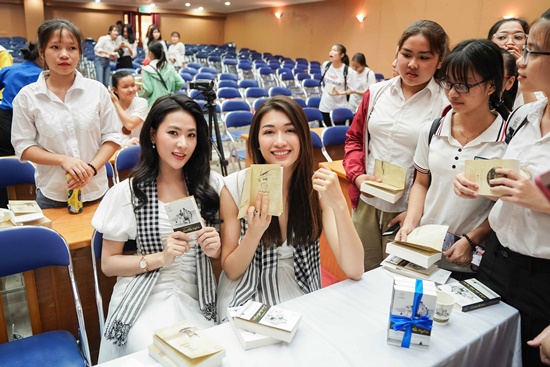 Á hậu Lệ Hằng và diễn viên Minh Trang xuất hiện xinh đẹp khó rời mắt trong sự kiện giao lưu, tặng sách cho các bạn sinh viên ở Đà Nẵng mới đây. |