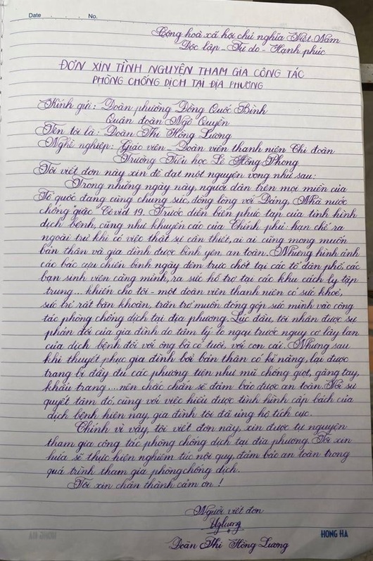 Lá đơn được cô giáo Lương viết tay với những nét chữ đẹp như vẽ. Cùng với đó là nội dung đầy nhiệt huyết: “Hình ảnh các bác cựu chiến binh ngày đêm trực chốt tại các tổ dân phố, các bạn sinh viên căng mình ra sức hỗ trợ tại các khu cách ly tập trung... khiến cho tôi, một đoàn viên thanh niên có sức khỏe, sức trẻ rất băn khoăn, trăn trở muốn đóng góp sức mình vào công tác phòng chống dịch tại địa phương.
