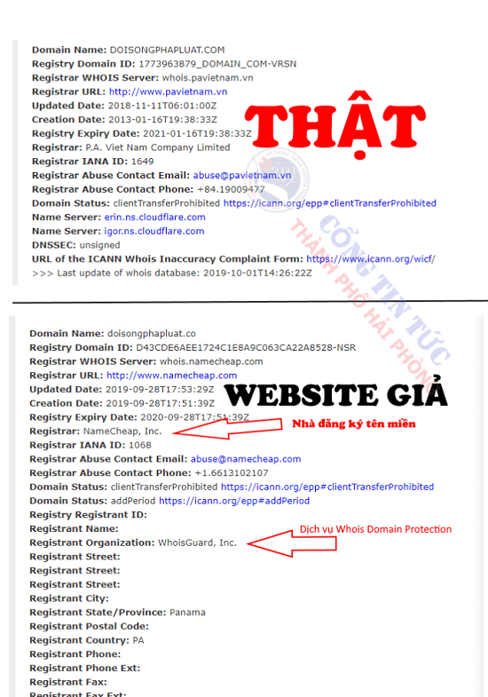 Tên miền doisongphapluat.co sử dụng dịch vụ WhoisGuard để ẩn danh chủ sở hữu. Sử dụng dịch vụ DNS Cloudflare để che dấu địa chỉ IP thực. |