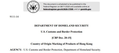 Tờ South China Morning Post dẫn thông báo của Hải quan Mỹ ngày 11/8 cho biết, dựa theo lệnh hành pháp do Tổng thống Donald Trump ký hôm 14/7, Mỹ xác định rằng "Hong Kong không còn đủ mức tự chủ để đáp ứng cách đối xử khác biệt so với Trung Quốc". Vì vậy, hàng hóa sản xuất tại Hong Kong và xuất khẩu sang Mỹ sẽ không còn được dán nhãn "Made in Hong Kong", mà phải ghi rõ xuất xứ "Made in China".