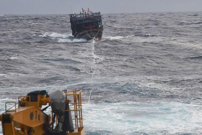 Tàu 360 Vùng 3 Hải quân lai dắt tàu cá gặp nạn trên biển vào đảo Lý Sơn - Ảnh: Vùng 3 Hải quân. |