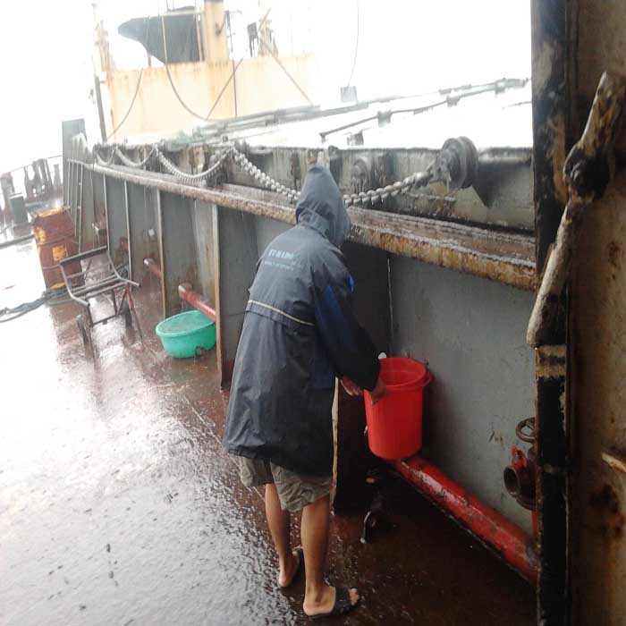Thủy thủ phải hứng nước từ boong trên tàu Phúc Hải 05 để lấy nước sinh hoạt vì bị bỏ rơi. |