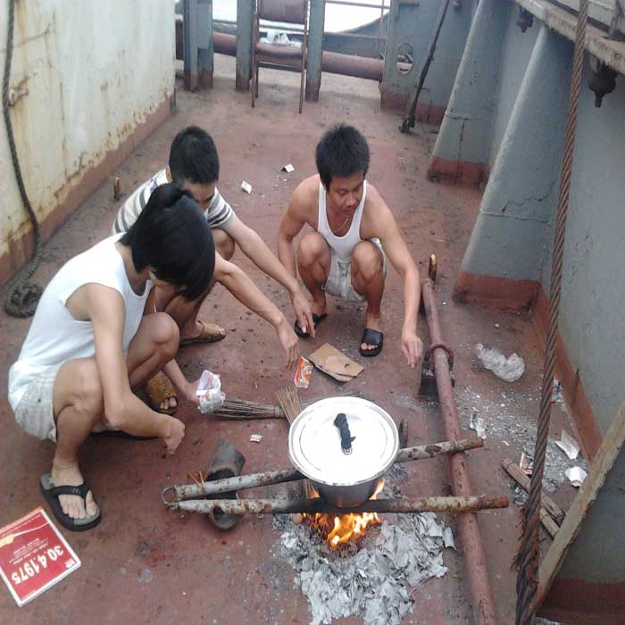 Cảnh nấu nồi cháo cầm hơi của anh em tàu Phúc Hải 05 trong lúc đợi được cứu (ảnh tư liệu do thuyền viên tàu Phúc Hải cung cấp). |