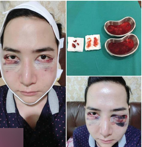 Ban đầu khi mới tiêm, chưa có bất cứ dấu hiệu nào cho thấy chất silicon vừa tiêm vào mặt kia là hàng kém chất lượng. Tuy nhiên, vài ngày sau đó khuôn mặt trở nên biến dạng một cách đáng sợ. Phần tiêm silicon lỏng vào mặt bắt đầu có dấu hiệu bầm tím, đau đớn ngay vị trí dưới mắt và gò má.