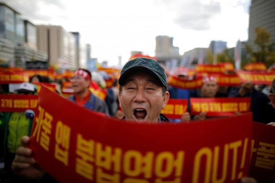 Khoảng 25.000 tài xế đã xuống đường tham gia biểu tình tại Seoul nhằm phản đối dịch vụ đi chung xe - Ảnh: Reuters. |
