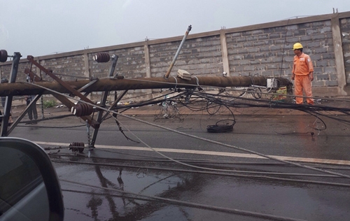 Tại hiện trường trong cơn mưa, hàng loạt cột điện ngã nghiêng ngổn ngang chắn cả quốc lộ tạo nên cảnh hỗn loạn. Hàng loạt cột điện và dây nhợ gây rối loạn cả đoạn đường hàng km.