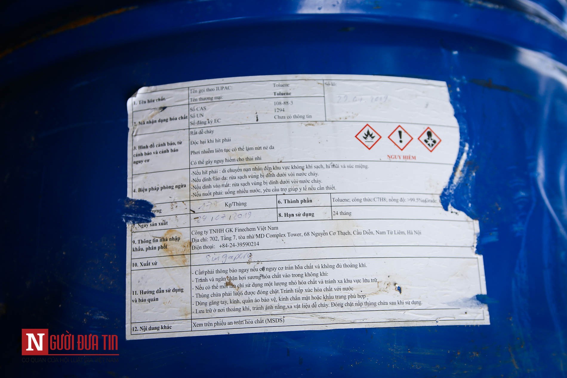 Trên mỗi thùng phuy có dán mảnh giấy ghi là hóa chất Toluene kèm những cảnh báo dễ cháy, độc hại, và nhiều nguy hiểm về sức khỏe.