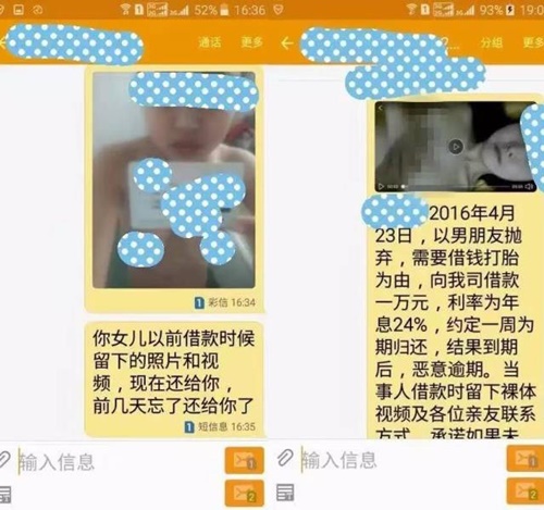 Một số nạn nhân cho biết họ bị buộc phải giao nộp các bức ảnh tự chụp khỏa thân như là tài sản thế chấp để đảm bảo cho khoản vay từ những kẻ cho vay nặng lãi. Sự việc này đã làm nổi lên hệ thống ngân hàng ngầm vốn bị che phủ bấy lâu ở Trung Quốc do thiếu những phương thức tài chính hợp pháp thích hợp dành cho học sinh, sinh viên.