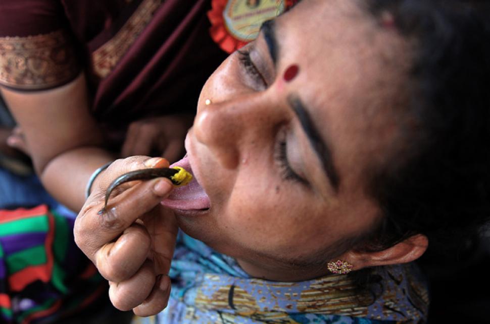 (ĐSPL) - Tại Ấn Độ, người dân tin rằng nuốt những con cá mòi sống có bôi một ít gia vị bí mật của dòng họ Goud có thể chữa trị bệnh hen suyễn và các bệnh hô hấp khác.