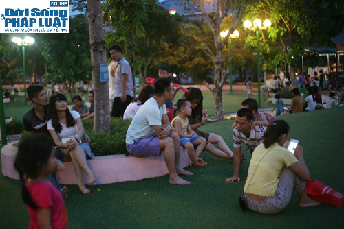 Tại quảng trường Đông Kinh - Nghĩa Thục, nam thanh nữ tú tụ tập đông đúc hóng mát. |