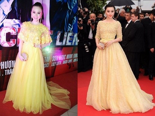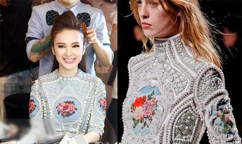 Tại một sự kiện thời trang trong nước, Angela Phương Trinh xuất hiện lộng lẫy hơn bao giờ hết với một bộ váy ôm xanh ngọc bích đính hạt trai. Mọi việc sẽ chỉ dừng lại ở việc trầm trồ khen ngợi vẻ đẹp của cô nàng nếu không có chuyện chiếc váy Angela mặc trông giống hệt một tác phẩm của nhà Balmain. Tuy nhiên nếu xem xét kỹ thì những người yêu thời trang có thể khẳng định 100\% nó là hàng copy bởi tuy giống 100\% về ý tưởng song vị trí đính hạt, độ tinh xảo, dụ ý thiết kế, chất lượng vải... lại cách xa nhau "một trời một vực".