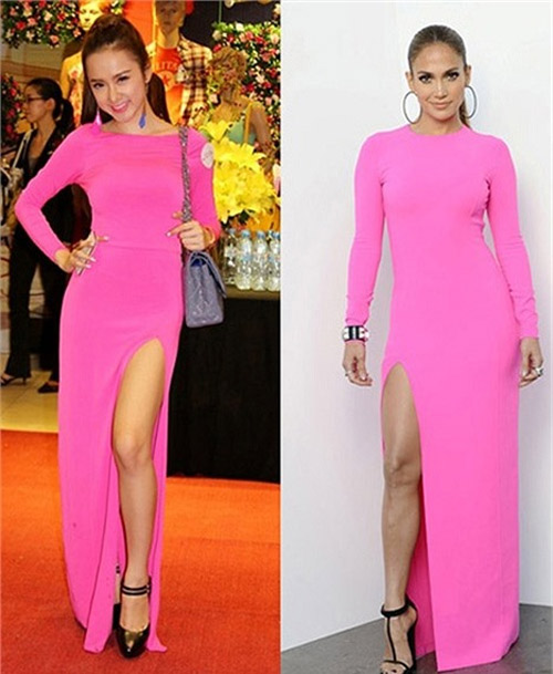 Chiếc váy hồng mà nữ diễn viên Hoa ngữ nổi tiếng Tôn Lệ diện trong một sự kiện là thiết kế của nhà mốt danh tiếng Valentino, Ngọc Trinh cũng có một chiếc váy như vậy, nhưng màu đậm hơn và nằm trong bộ sưu tập của hãng thời trang Ngọc Trinh Fashion.