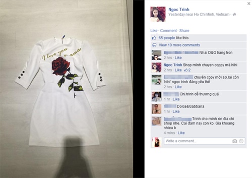 Không chỉ nhái để mặc, cô nàng còn công khai copy nhiều mẫu khác trong bộ sưu tập của Dolce & Gabbana và bán với thương hiệu Ngọc Trinh Fashion. Mỗi mẫu váy này được "búp bê 9x" bán với giá khoảng 3,5 triệu đồng. Cô cũng công khai thừa nhận shop của mình chuyên bán đồ copy.