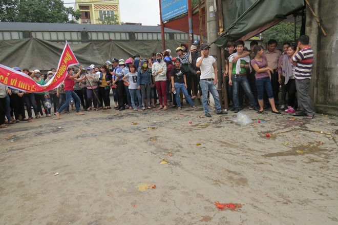 Công nhân ném trứng thôi, cà chua nẫu vào cổng công ty để đòi quyền lợi. (Ảnh: Tri Thức Trực Tuyến) |