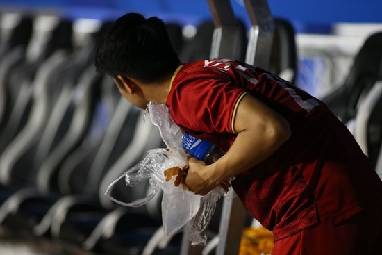 HLV Park Hang-seo không quên nhắc nhở các học trò nhặt hết rác ở khu vực băng ghế dành cho U22 Việt Nam. |