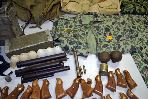 Tang vật thu được gồm 79 bộ bang súng ngắn, 2 máy truyền tín hiệu dùng trong quân sự, mặt nạ phòng độc, vỏ đạn M79…