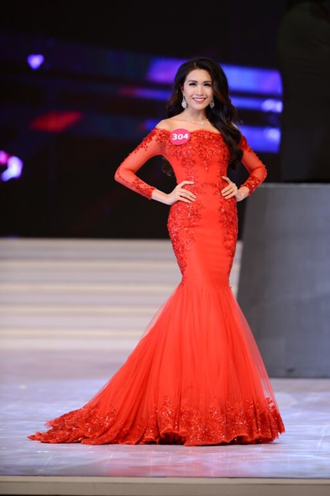 Nhờ sự thể hiện tốt qua các phần thi, Lệ Hằng (ở giữa) lọt vào top 5 thí sinh lọt vào vòng thi ứng xử cùng với Nguyễn Thị Loan, Phạm Thị Hương, Ngô Trà My, Ngô Thị Trúc Linh. |