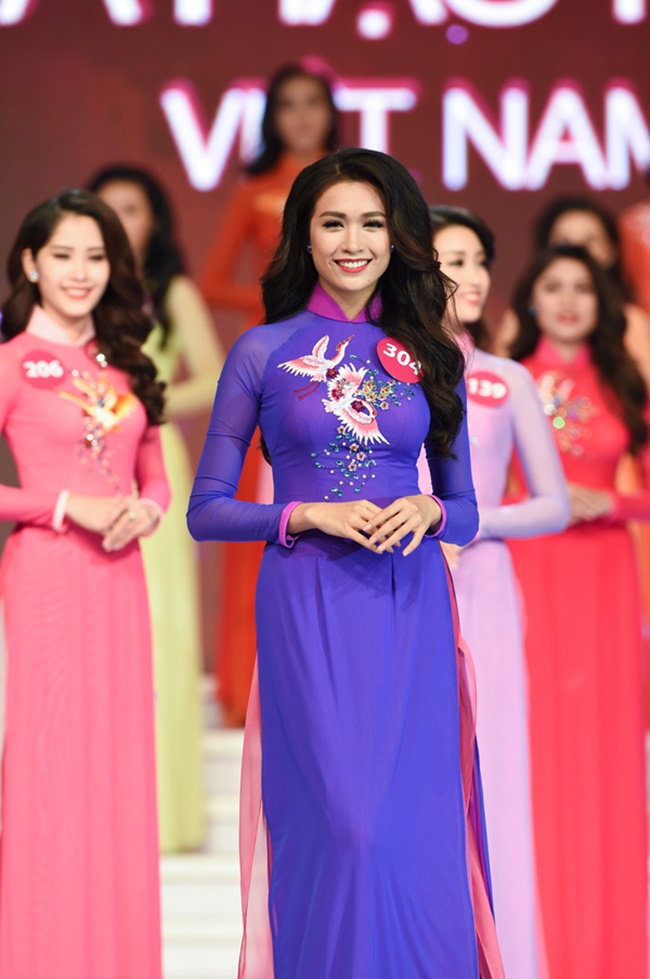 Duyên dáng, tự tin trong tà áo dài sắc tím nằm trong bộ sưu tập của nhà thiết kế Thuận Việt. |