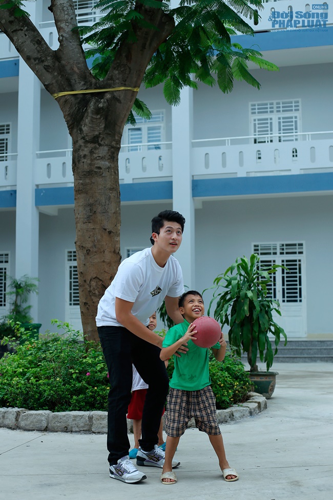 | Chàng diễn viên trẻ cũng dạy các em chơi bóng rổ. |