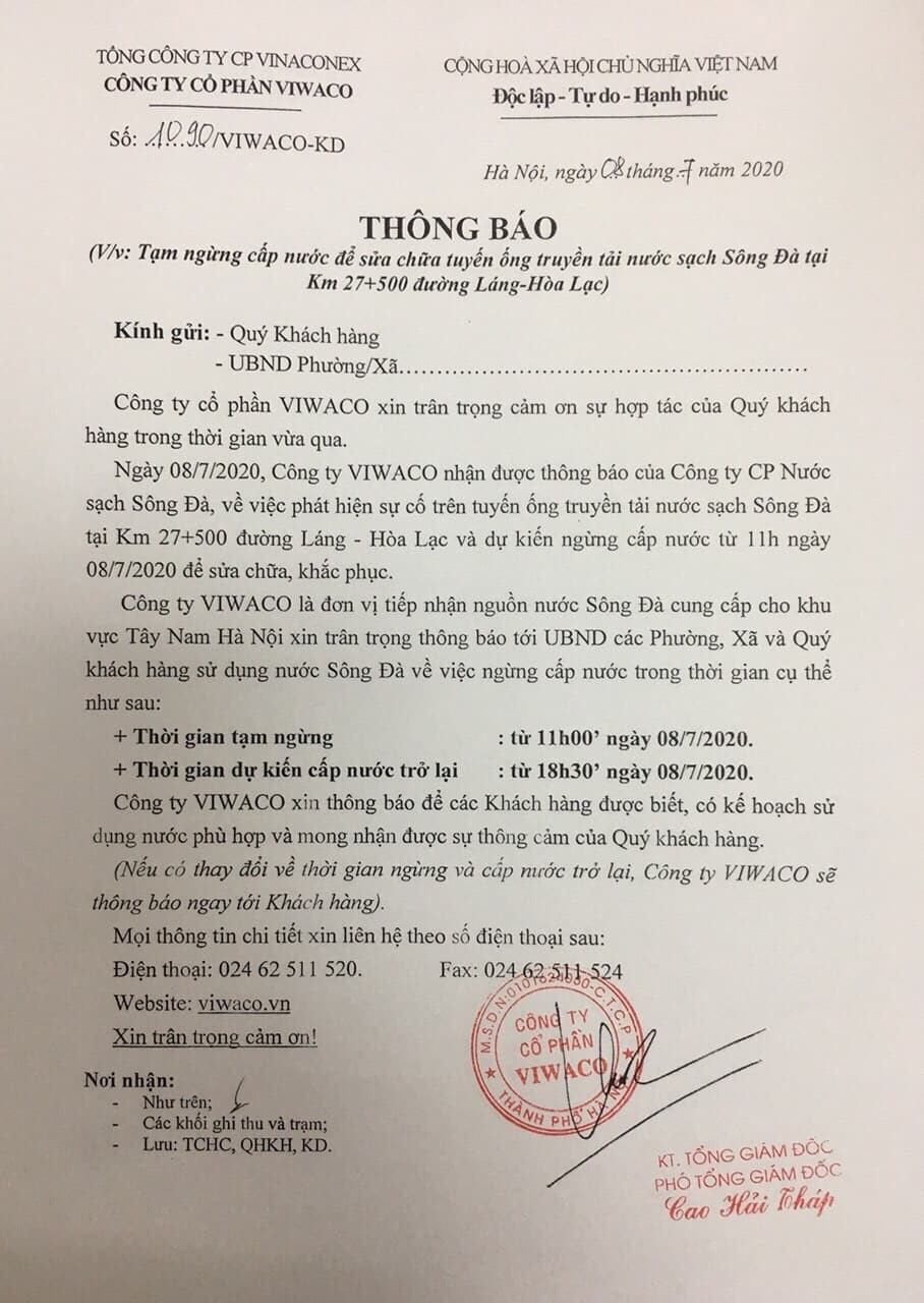 Thông báo của đơn vị cung cấp nước |