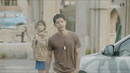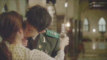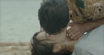"Hậu duệ của Mặt Trời" tập 5 bắt đầu với cảnh hôn "rượu vang" còn dang dở của hai nhân vật chính Yoo Shi Jin (Song Joong Ki) và Kang Mo Yeon (Song Hye Kyo).