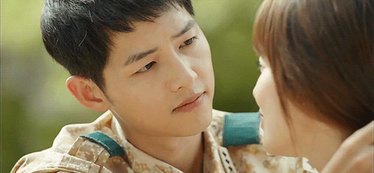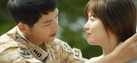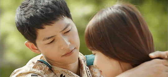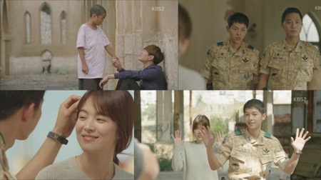 Trong tập này, người xem không khỏi rung động với cảnh đại úy Yoo Shi Jin (Song Joong Ki) dịu dàng buộc tóc cho cô bạn gái Kang Mo Yeon (Song Hye Kyo) của mình.