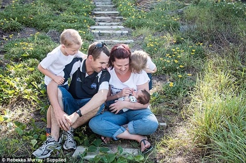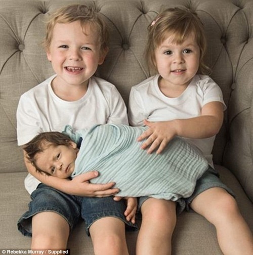 Cô Murray, chụp ảnh chung với chồng mình Reid và các con Callum, 4 tuổi, Ella, 3 tuổi và Jackson, đứa con bị nhiễm CMV từ trong bụng mẹ. |
