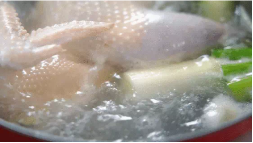 - Bước 1: Gà sơ chế sạch cho vào nồi, đổ lượng nước thích hợp vào sau đó thêm gừng và gốc hành vào. Đun sôi rồi hớt bỏ bọt, đậy nắp nồi gà chuyển sang lửa nhỏ và hầm trong khoảng 60 phút. Cuối cùng thêm chút muối cho vừa ăn.